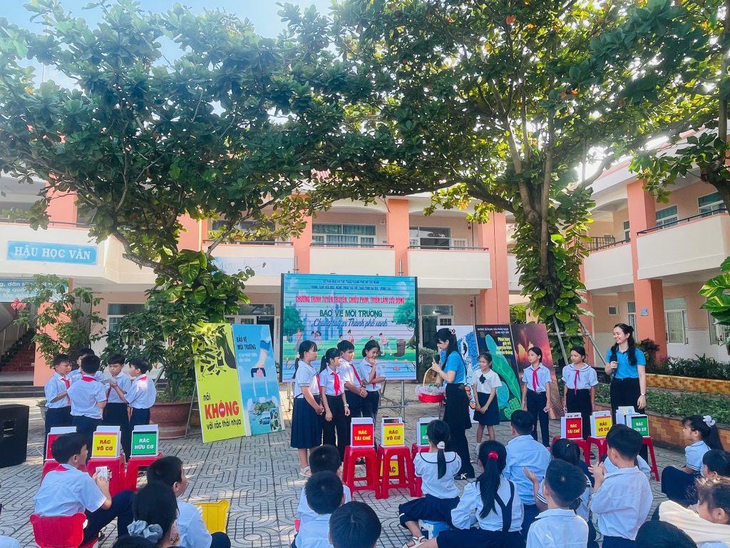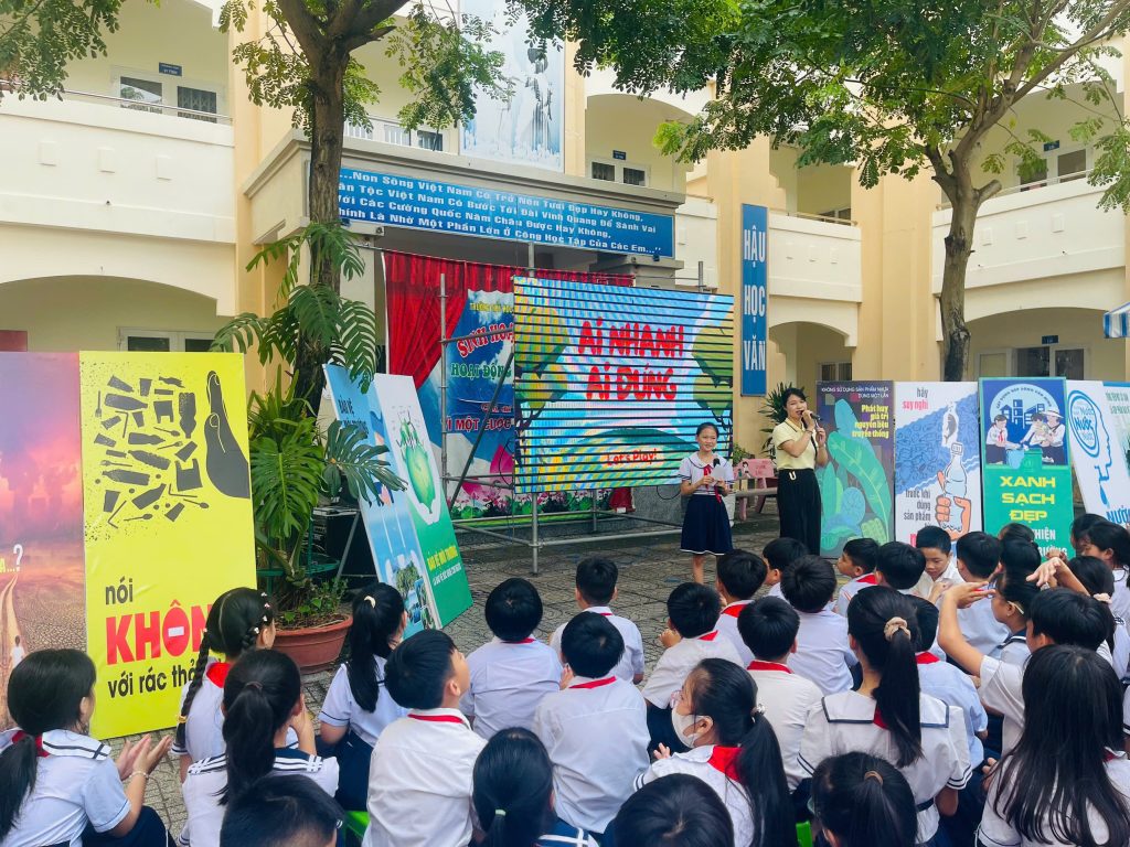 Từ những bộ phim tài liệu được chiếu trong sân trường đến các mô hình trực quan mô phỏng ô nhiễm, từ triển lãm pano cho đến những hoạt động tương tác như tham gia trả lời các câu hỏi kiến thức “Ai nhanh – Ai đúng”, trò chơi phân loại rác trong 3 phút, hát cho nhau nghe… mỗi nội dung đều hướng đến mục tiêu chung: giúp các em hiểu rằng môi trường không phải điều gì xa vời, mà hiện hữu ngay trong từng hơi thở, từng giọt nước, từng cái cây cạnh lớp học. Thông điệp bảo vệ môi trường vì thế không đến bằng khẩu hiệu, mà đến bằng trải nghiệm thực tế, một cách giáo dục hiện đại, dễ tiếp thu, hiệu quả và bền vững.